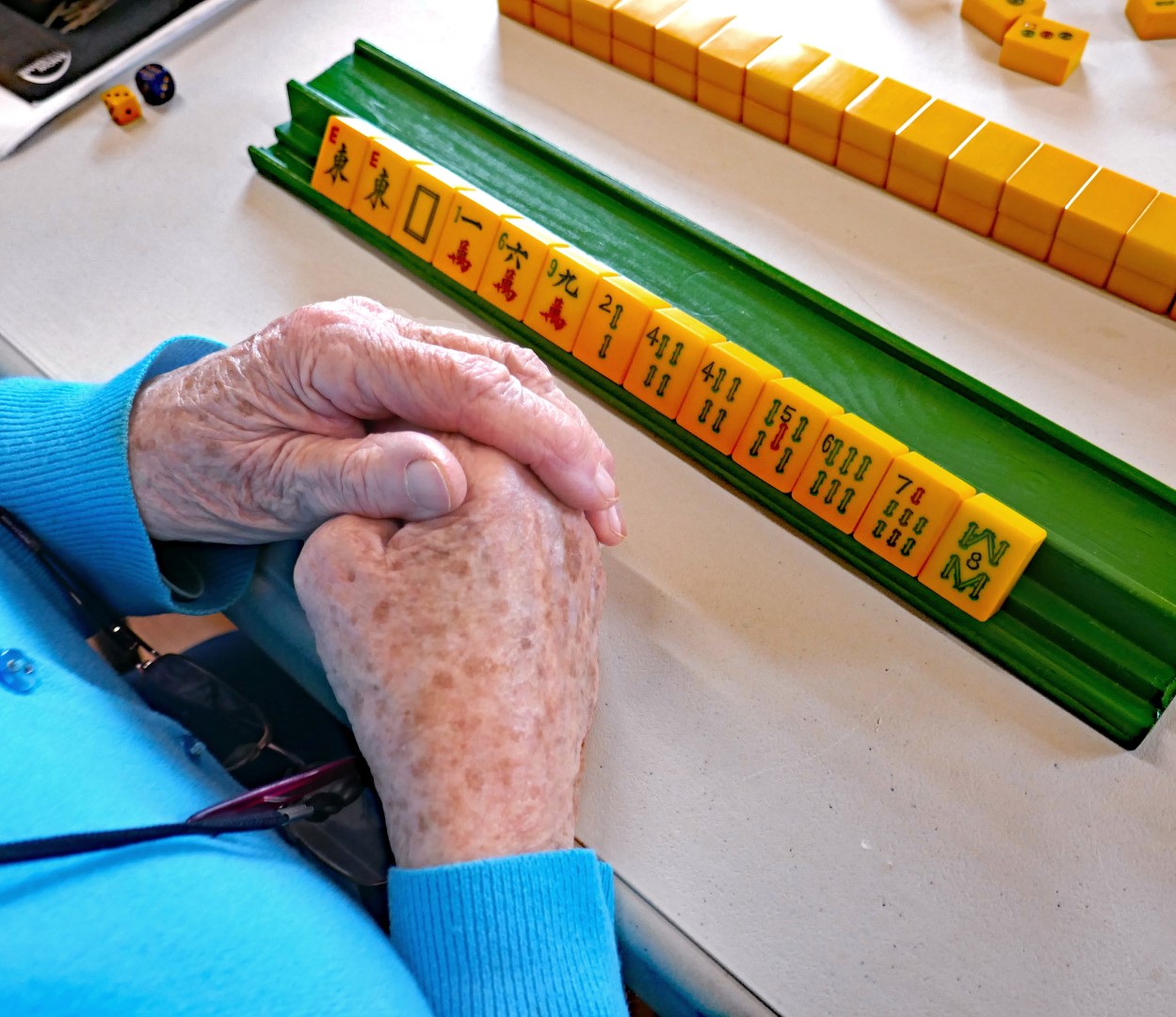 If you enjoy playing the card game of rummy, you will most likely enjoy Mah-Jong! The principles are along the same lines, but Mah-Jong is played using tiles with pretty and colourful designs originating in the Far East. It is usually played with tables of 4, although can be played with just 3. We play by British rules and it is an easy game to learn. None of us are experts!